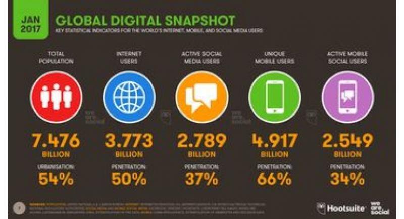 According to 2017 statistics, there are 3.77 billion global Internet users in 2017, equalling 50 per cent penetration; 2.80 billion global social media users, equalling 37 per cent penetration; 4.92 billion global mobile users, equalling 66 per cent penetration; 2.56 billion global mobile social media users, equalling 34 per cent penetration; and 1.61 billion global e-commerce users, equalling 22 per cent penetration.