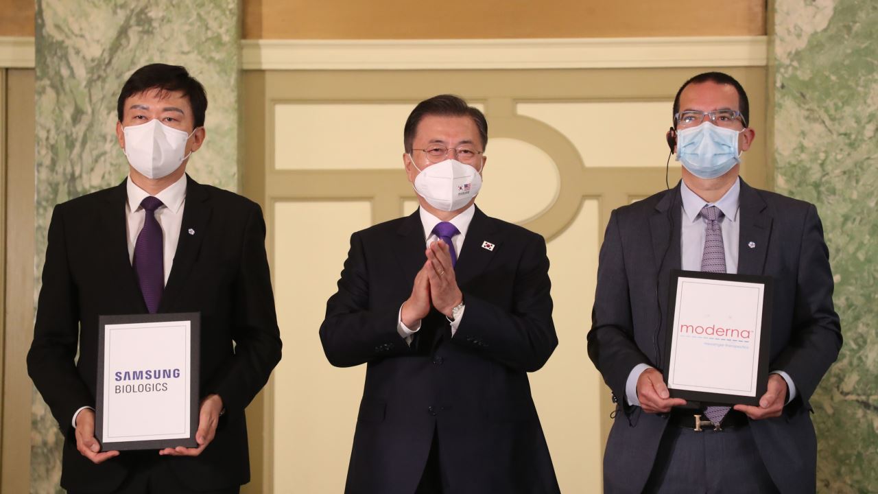 The two sides signed the contract during a South Korea-US vaccine partnership event held in Washington, D.C., with President Moon Jae-in attendance. Also present were John Rim, CEO of Samsung Biologics, and his Moderna counterpart Stephane Bancel, along with Stanley Erck, CEO of Novavax, another American vaccine production company.