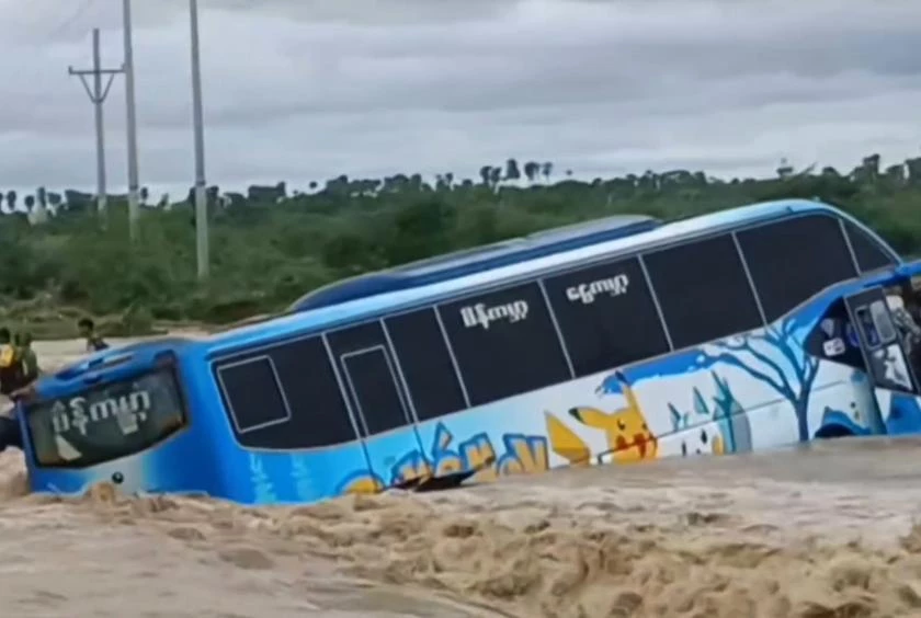 The Sintewa Creek, located near Nat Saunt Village in Taungtha Township, Mandalay Region, lies along the Myingyan-Taungtha road section. On the morning of May 26, a long-distance passenger bus carrying over 40 passengers was caught in the strong current and swept away.