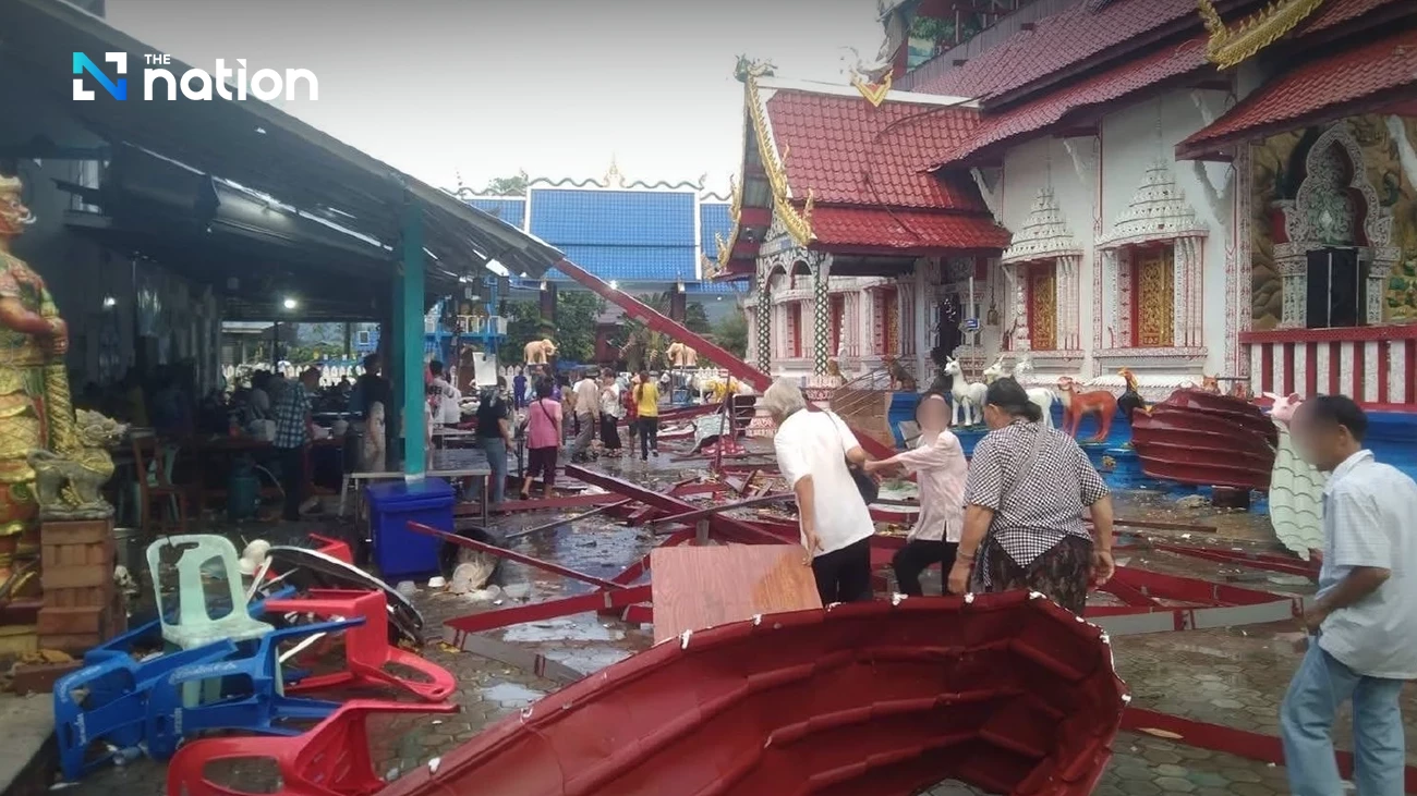 Heavy rain and strong gusts caused damage to homes and Wat Ban Tha Makhiang in San Sai subdistrict.