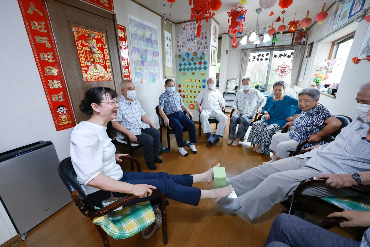 One day in July at Isshoen, a nursing care facility in Tokorozawa, Saitama Prefecture, eastern Japan, 10 clients took part in light exercises and recreational activities, occasionally chanting, "Yi, er, san, si," meaning one, two, three, four in Chinese. Much of the conversation in the room was in Chinese as well.