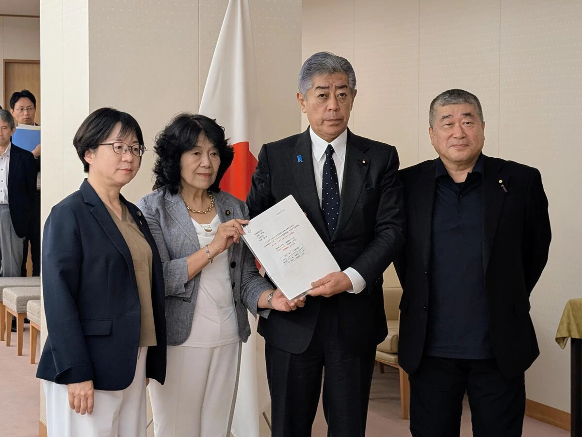 Members of the Nonpartisan Parliamentary Association for Reconsidering Human Rights Diplomacy, including its secretary-general, Tomoko Abe of the Constitutional Democratic Party of Japan, visited the Foreign Ministry on the day and handed a written request for state recognition of Palestine to Foreign Minister Takeshi Iwaya.