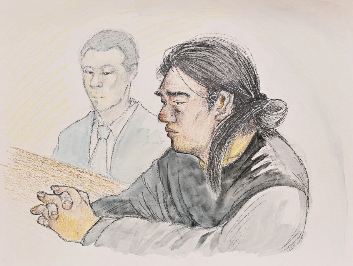Yamagami entered the courtroom at around 2 p.m., wearing a black, long-sleeved shirt and dark grey pants. He had stubble, and his grown-out, partially greyed hair was tied back.