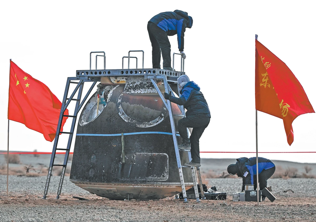 The capsule touched down at 9.34am at the Dongfeng landing site in North China's Inner Mongolia autonomous region, the agency said, adding that a preliminary on-site inspection by ground recovery personnel confirmed that its exterior was intact and the payloads inside were in good condition.