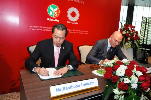 According to the first part of the agreement, KBank’s subsidiary Kasi-korn Securities and Macquarie’s subsidiary Macquarie Securities (Thai-land) will jointly provide researches, investment banking financial services, and brokerage services through KBank’s securities arm, Kasikorn Securities (KSecurities). In the next stage, they will extend their cooperation to derivative products and business in private banking and the debt capital market.