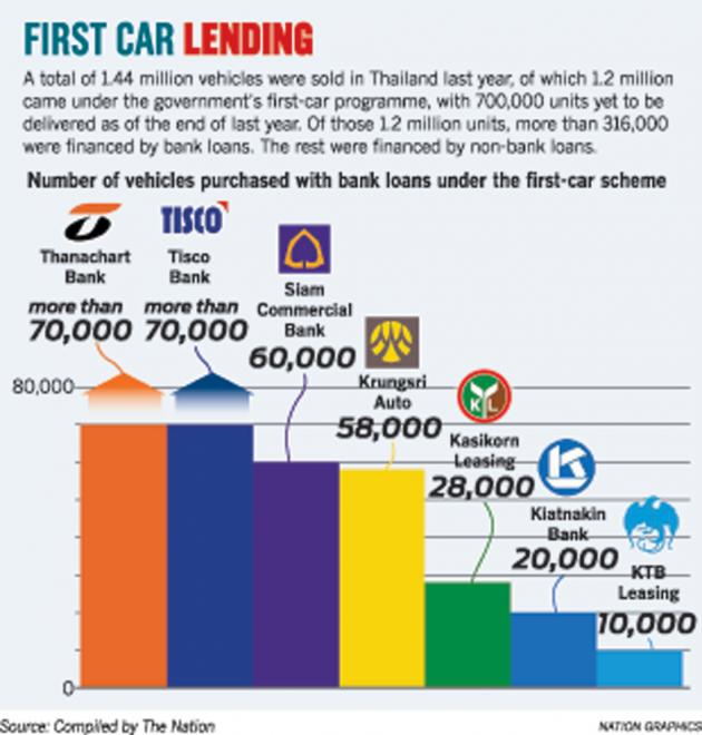 The first-car scheme was the key driver of Bt100 billion in new auto loans booked last year, leading to outstanding loans in 2012 of Bt170 billion.