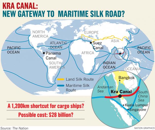 “The Kra Canal can be comparable to the sea lanes in the Panama and Suez canals, given the rise of China and East Asia on the global stage. And it could be seen as a missing link in China’s grand design of so-called maritime Silk Road that will complement the highway and railway Silk Road linking modern China with the rest of Asia and Europe based on the historical Silk Road.”