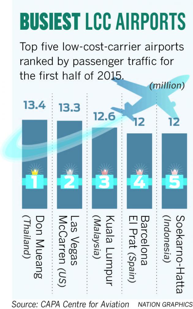 Don Mueang now serves more LCC passengers than Las Vegas McCarren International Airport in the US (13.3 million in the first half), Kuala Lumpur International Airport in Malaysia (12.6 million), Barcelona El Prat Airport in Spain (12 million), and Soekarno-Hatta International Airport in Indonesia (12 million).