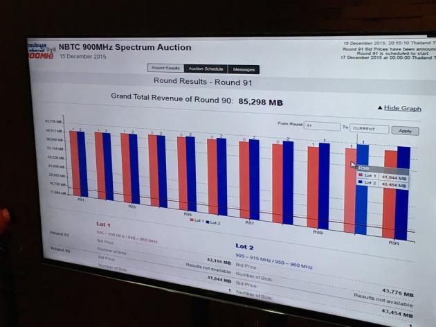 At round 88, the price of the first 900MHz licence block was Bt41.200 billion, while that of the second one was Bt42.810 billion. The starting price of both blocks was Bt12.864 billion.