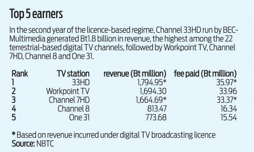 In this round, Channel 33HD generated Bt1.8 billion in revenue, the highest among the 22 existing terrestrial-based digital TV stations. So it became the top contributor in annual-licence-fee payment – Bt35.97 million – to the broadcasting regulator under the digital-terrestrial-TV licence regime.