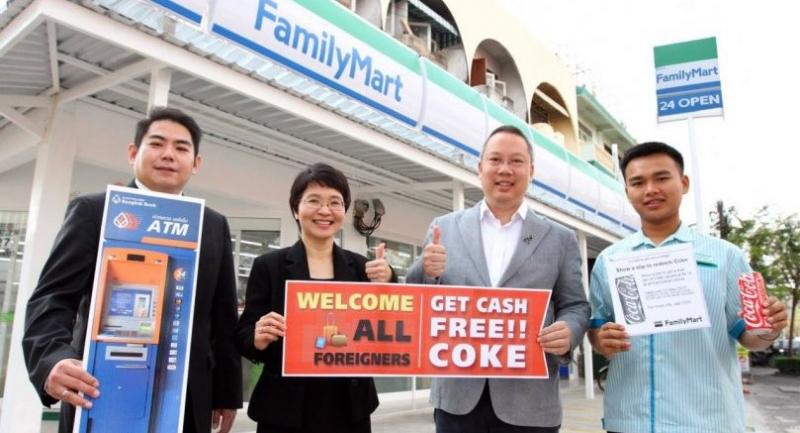 Bangkok Bank Executive Vice President Prassanee Ouiyamaphan (2nd from left) and Senior Vice President Arj-harn Petchdee (left) in collaboration with Central FamilyMart Co., Ltd Vice President Akarin Phureesitr (2nd from right) launched a campaign to provide special privilege for customers holding Visa, MasterCard, JCB, UnionPay, AMEX, Diners Club, EXK, DISCOVER and MEPS debit and credit card issuing overseas when make a cash withdrawal at 9,400 Bualuang ATMs nationwide.