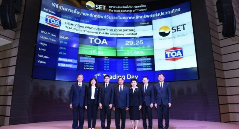 The company’s CEO expressed confidence that the shares would attract investors who believe in TOA’s fundamentals and potential to expand its business both at the domestic level and internationally – just as it had attracted institutional and retail investors during the initial public offering of 507.6 million shares issued by TOA and its existing shareholder at the price of Bt24 per share, with a par value of Bt1 apiece.