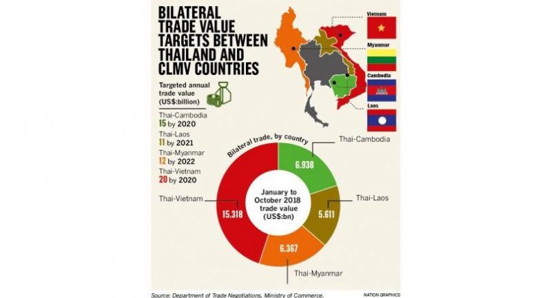In the first 10 months of 2018, Thai-Cambodia trade value reached $6.938 billion (Bt225.61 billion), with the aim to reach an annual value of $15 billion (Bt487.76 billion) by 2020. The Thai-Laos trade value for the first 10 months of this year was at $5.611 billion, with the aim to reach an annual value of $11 billion in 2021. The Thai-Myanmar trade value stood at $6.367 billion from January to October and is projected to reach an annual value of $12 billion in 2022, according the Department of Trade Negotiations.