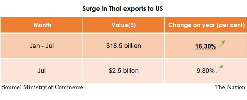 As of July 30, Thai exports to the US had risen 16.4 per cent to US$18.5 billion (Bt569.31 billion), closely followed by Thai exports to China at $16.3 billion for the same period. In July alone, Thai exports to the US rose 9.8 per cent to $2.5 billion.