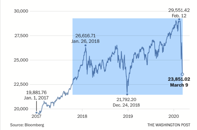 As the stock markets approached a 20% fall in value from its most recent high, stocks came close to so-called bear market territory. If the markets fall into a bear market, it would mark the end of an 11-year bull market run of rising stocks that began on March 9, 2009. At the end of trading Monday, the Dow had shed more than 19% since its record high from Feb. 12.