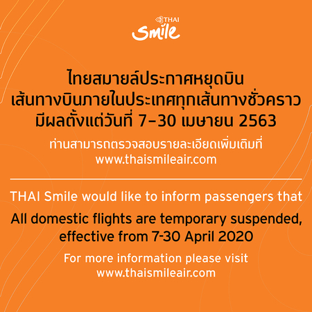 • Passengers can obtain a full refund without any penalties via https://member.thaismileair.com/customerservice/refund by selecting "Refund due to terms and conditions"