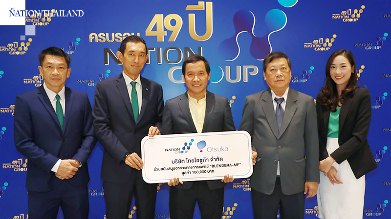 The chairman of Thai Otsuka Pharmaceutical Co Ltd, Thanan Suntayodom (4th from left), along with president Shinsuke Yuasa (2nd from left), director of BIV & CN Business Division Wattanachai Itsarasenarak (1st from left), and finance manager Thanasunun Suntayodom (5th from left) recently donated medical food 'Blendera-MF” for those at risk of malnutrition to Yuttana Nualjaras, (3rd from left), editor and representative of Nation Group, at Interlink Tower in Bang Na district.