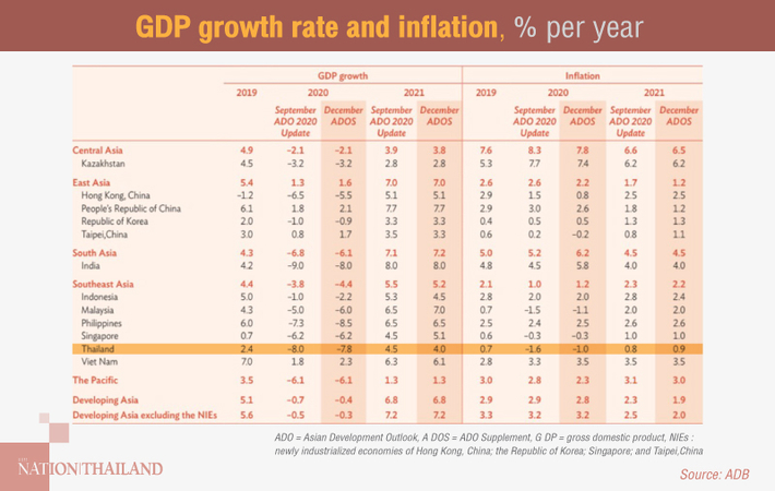 The ADB also downgraded its 2020 GDP forecast for Southeast Asia to -4.4 per cent from -3.8 per cent in September. It projects the Thai economy this year will contract 7.8 per cent, down sharply from 2.4 per cent growth last year.