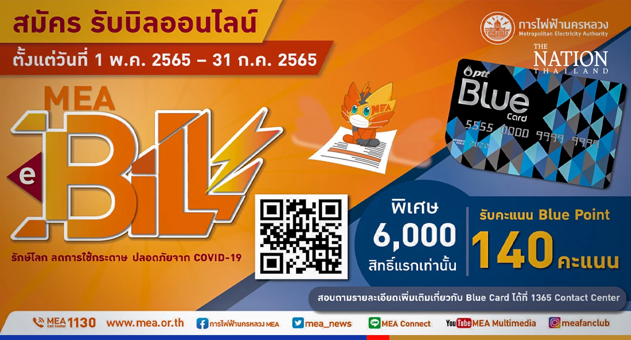 Under a separate campaign, customers who sign up for e-bills and register at https://eservice.mea.or.th/measy will get 500 MEA Points and another 500 points after joining the MEA Point programme. The 1,000 points can be redeemed for a 100-baht reward. Registrants will get another 80 points each time they make their payment via e-bill, or 50 points after paying via other channels.