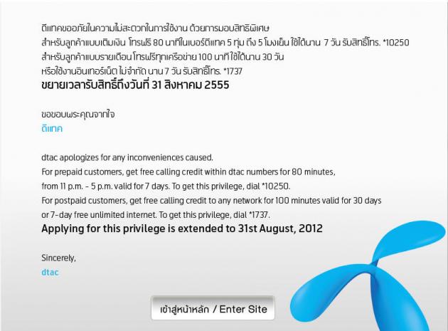 Posted on its website: "For prepaid customers, get free calling credit within Dtac numbers for 80 minutes from 11pm-5pm, valid for 7 days. To get this privilege, dial *10250. For post-paid customers, get free calling credit of 100 minutes to any network or 7-day free unlimited internet. To get the privilege, dial *1737."