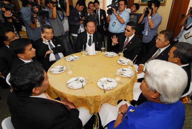 Leaders at the lunchoen included Democrat Abhisit Vejjajiva, Yongyuth Wichaidit from Pheu Thai, Chumpol Silapa-archa from Chart Thai Pattana, Chaovarat Chanweerakul from Bhum Jai Thai, Purachai Piumsombun from Rak Santi, Chuwit Kamolvisit from Rak Prathet Thai and Apirat Sirinawin from Mahachon.