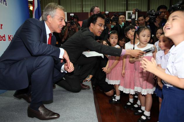 The former British PM visited Education Minister Woravat Auapinyakul at the Education Ministry and received a warm welcome from the students. Upon his arrival, Blair taught them to greet in English: “Hello. Thank you, it is wonderful to be with you today.”