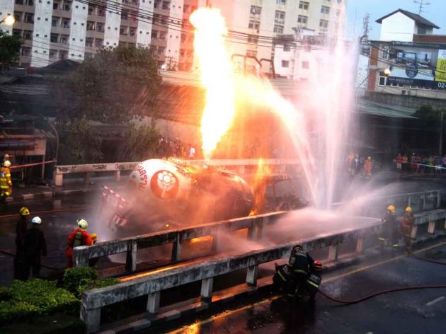 Explosions erupted at about 5.30am after the tanker truck crashed and overturned, causing the gas to leak before bursting into flames near Pattanakarn Soi 20.