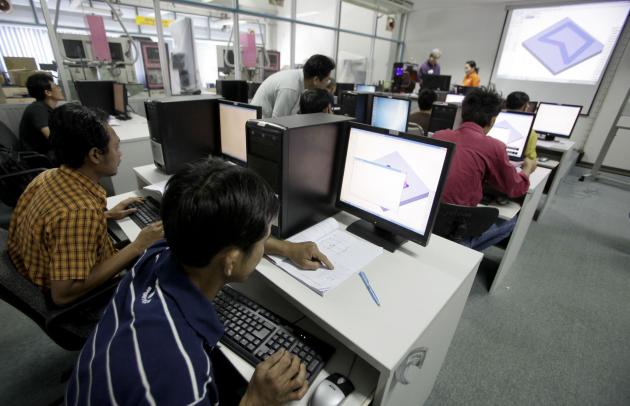 Samphan Phumatna, 30, who works for the safety department of a factory in Samut Prakan, is being trained in a course of construction or building design using a computer-aided design (CAD) programme.