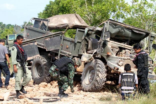 In Pattani’s Yarang district yesterday, three soldiers were wounded when a roadside bomb went off as their transport truck passed. Six other soldiers complained of discomfort in the chest but had no visible wounds.