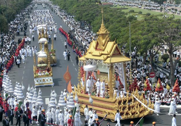 On Monday, Monineath and Sihamoni were scheduled to light the funeral pyre in the early evening. A fireworks display and gun salute were also to take place.