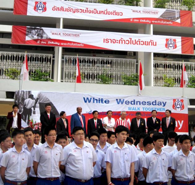 Yesterday, the college’s primary section joined with alumni for a “White Wednesday Walk Together”, with new college director Surasit Suckchai promising to pull the school out of crisis.