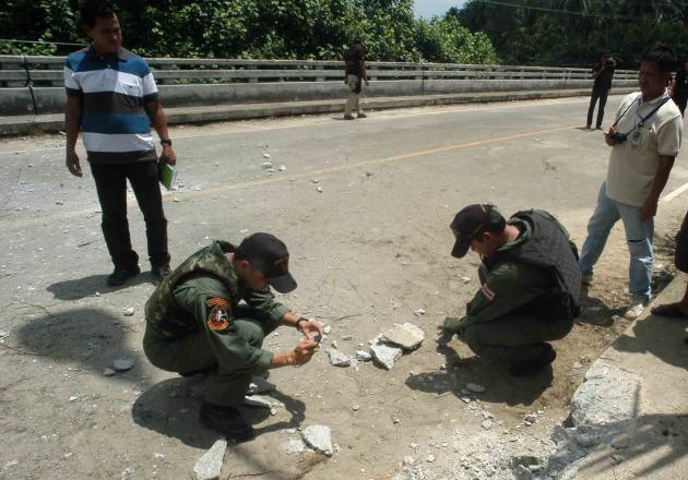 First Lieutenant Narasak Baikhaikhom, who alerted officials to the bomb, told police he and his patrol team were travelling along Tak Bai-Taba road near Tambon Jehe Municipality, when they heard a loud explosion in the forest. Police suspect a group of three to four insurgents were making the bomb to attack security officers in Tak Bai, but detonated the device by mistake. Although there were signs the bomb-makers were injured by the blast, they managed to flee before authorities arrived.