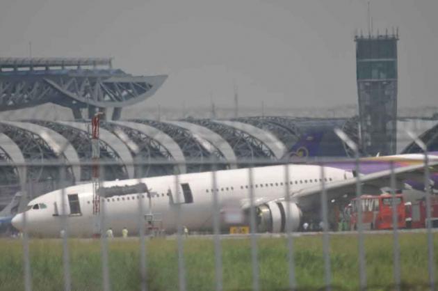 Department of Civil Aviation director general Voradej Harnprasert said this caused the plane to lose balance and skid off the runway. The slide resulted in the engine on the right wing to make contact with the ground, causing sparks and fire at the body of the plane.