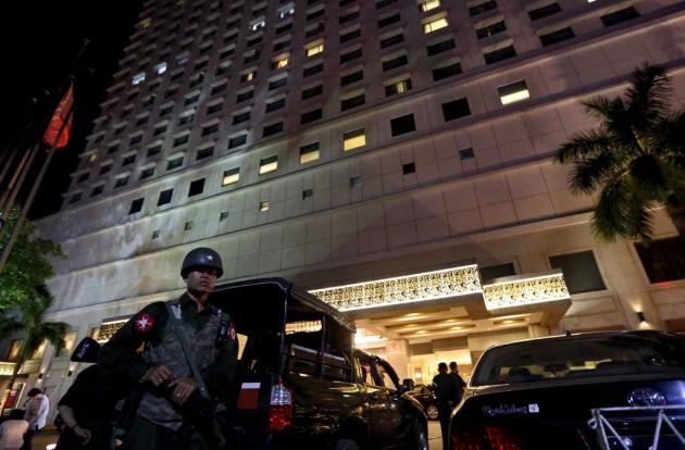 A dozen police and heavily armed soldiers with a sniffer dog entered the glitzy hotel soon after the explosion. Later, many of them crowded into the destroyed room, blocked off with yellow security tape, to inspect the damage.