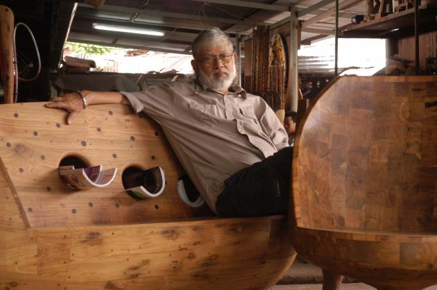 One of his trademarks was the use of an age-old technique of joining sections of wood without nails by using wood reclaimed from buffalo carts, ploughs and rice barges.