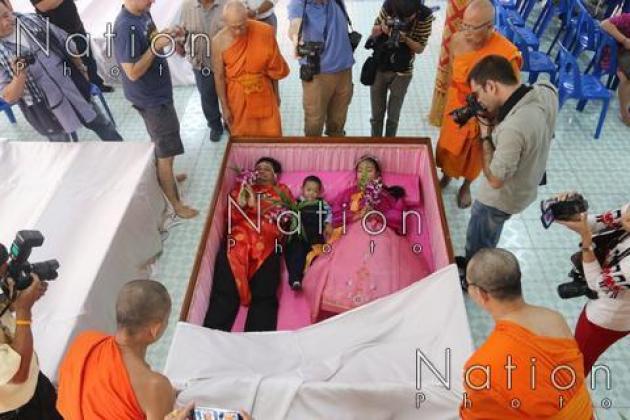 In Nonthaburi’s Bang Kruay district, Wat Takien in Tambon Bang Khuwiang hosted a wedding ceremony for 10 Thai couples that required each couple to lie in an open coffin while four monks recited funeral prayers for five minutes.