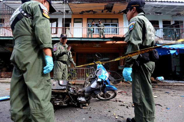 Police security camera footage showed two suspects on a motorcycle with the pillion rider hurling a pipe bomb into a Narathiwat shop on Friday at 6.51pm. They suspected the Songkhla attacks may have been carried out by the same people who were behind the May 6, 2014 Hat Yai bombings that injured eight people.