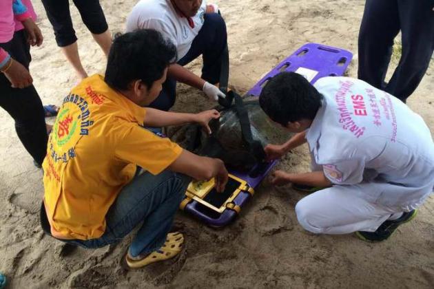 Officers from the Phuket Marine Biological Center (PMBC) and rescue workers from the Kusoldharm Foundation went to the scene at about 7pm after being notified of the turtle by a beach guard.