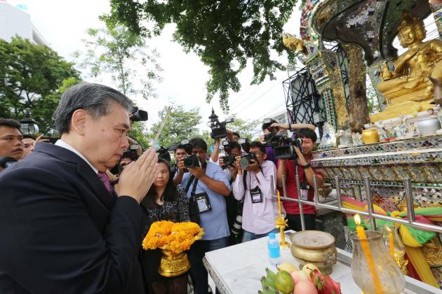 Deputy Prime Minister Somkid Jatusripitak was the first to come into work early yesterday, and later joined others to worship and pay tribute to shrines in the compound.