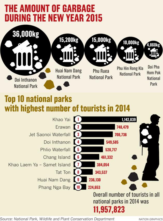 The Department of Health had earlier reported an overwhelming amount of garbage at national parks and other tourist destinations. Some top attractions, such as Doi Inthanon National Park, accumulated many tonnes of garbage during the New Year holiday last year.