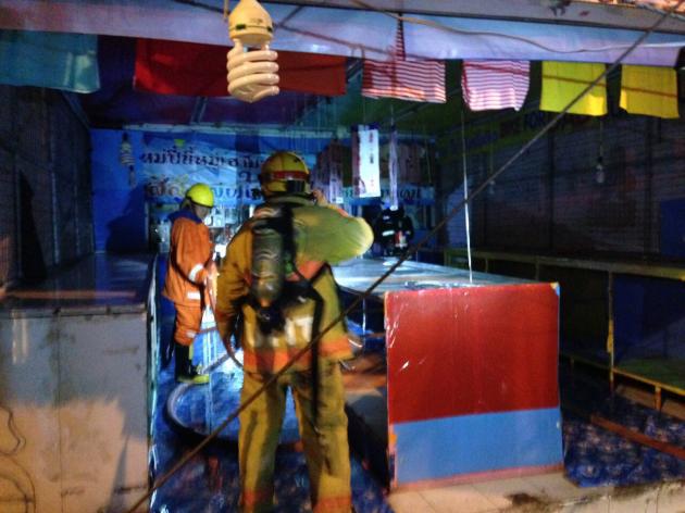 The fire broke out at 8.50pm on Monday in the second-floor fabric storage of “Dang Jai” shop, located next to a branch of Thanachart Bank, Chiang Mai Police’s traffic division superintendent Pol Colonel Piyapan Pattarapongsin said yesterday. Fire-fighters took half an hour to control the blaze, he said. An eyewitness told police no one was at the scene when the storage room caught fire, so it was suspected that a short circuit was the cause of fire. Previous fires this year, also occurring at Warorot Market fabric shops, caused over Bt10 million in damages.