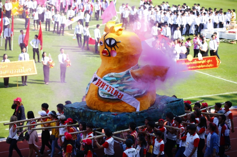 Yesterday, a figure looking like chief constitution drafter Meechai Ruchupan holding a constitution above his head, as if he was throwing it to a puppet under a giant machine gun, needed urgent modification less than an hour before the parade was staged. Security officers asked students to remove the gun because it could be interpreted as relating to the military.