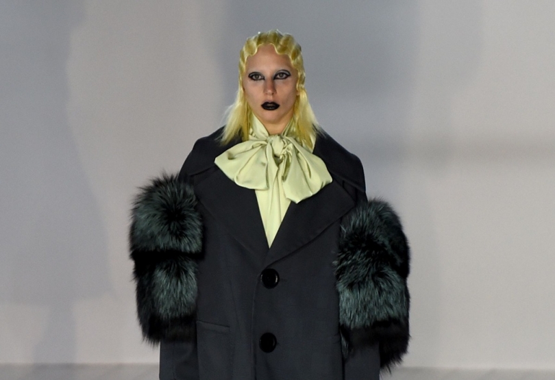 It was a dark and brooding show, emphasized by heavy black eye makeup and fur accessories in the look that kept the slender form of his girls almost hidden in the giant clothes.