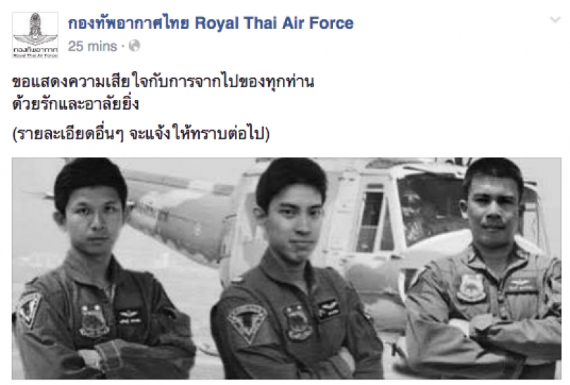 The two pilots were identified as Sqn Ldr Pasit Techasen and Flight Lt Alongkorn Chankrajang. The mechanic was identified as Flight Sgt 1s Class Wisut Puttharaksa.