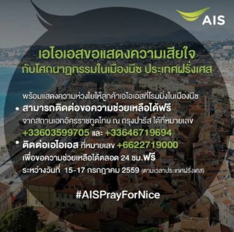 The customers can also make calls to enquire or request emergency support from AIS CALL CENTER +6622719000 24 hours free of charge during the same period.