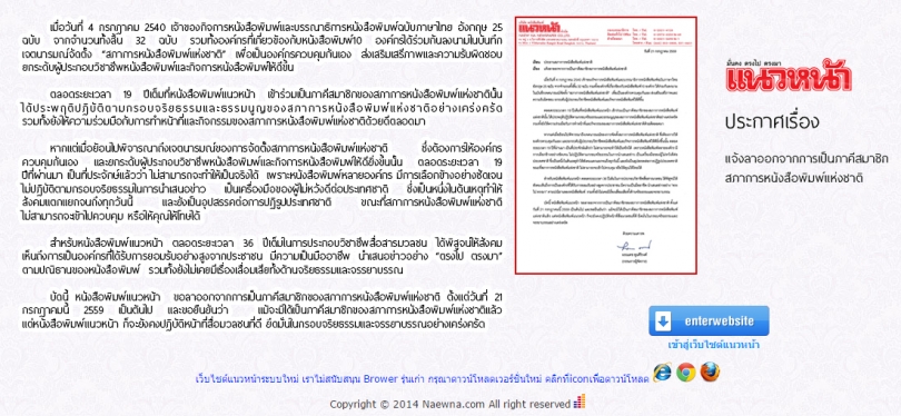 Chavarong responded by saying that Naew Na may have a different view from 50 other papers in Bangkok and the provinces, many of which want to promote the council’s self-regulatory ideology as well as encourage liberty and responsibility among members.