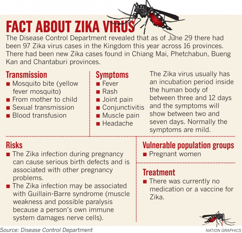Insisting that Thailand does not have a Zika outbreak and that the affected areas were well controlled, Piyasakol called on people to help eradicate the breeding grounds of Zika-carrying Aedes aegypti mosquitoes and larvae at home, workplace or public venues. He said these measures would be effective in preventing Zika and dengue fever.