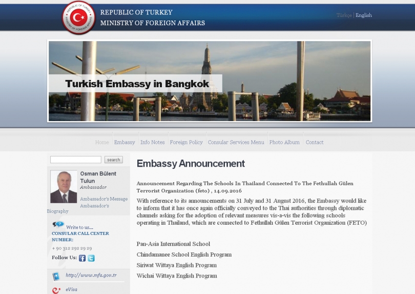 The Turkish embassy in Bangkok said in a statement on Wednesday that Pan-Asia International School, Chindamanee School English Programme, Siriwat Wittaya English Programme and Wichai Wittaya English Programme in Thailand were connected to the Fethullah Gulen Terrorist Organisation (FETO).