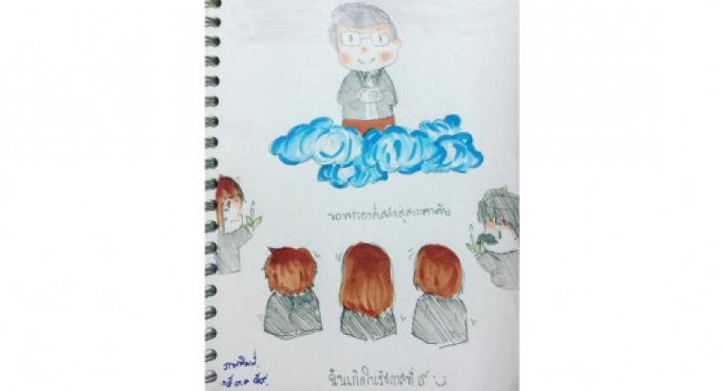 Since I couldn’t explain my sorrow in words, two days after his passing, I drew a picture that took just 10 minutes. I wanted to show that Nai Luang had gone to heaven, while his black-clad people were in deep mourning.
