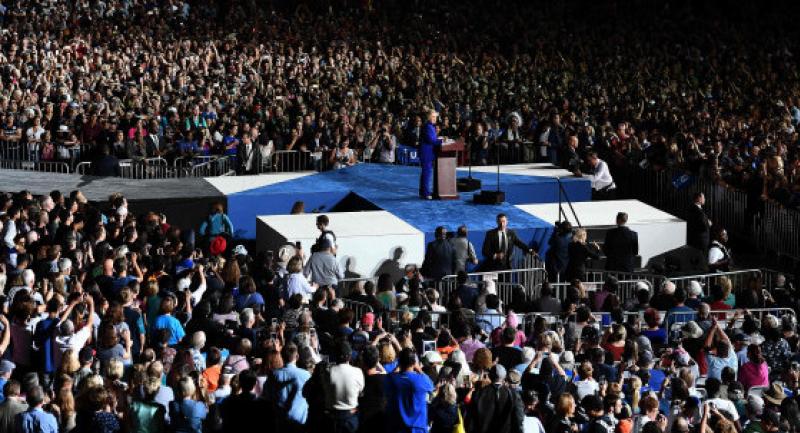 "Imagine it is January 20, 2016 and imagine that it is Donald Trump standing in front of the Capitol," she told a 15,000-strong crowd in Tempe, triggering a chorus of boos for her Republican opponent.